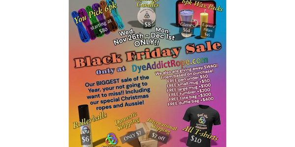 Wednesday 11/26 THRU Monday 12/1 ONLY!!! We may gone a little crazy for the Black Friday/ Cyber Monday weekend! This year we are doing a Black Friday giveaway! This give away is based on the total amount of a single purchase. If you spend under $50 you get a free pen. If your purchase total is between $50-$99 you will receive a small coffee mug. If you spend between $100-$199 you will receive a large coffee mug. Should your purchase be between $200-$299 we will send you a free Dye Addict Rope Tumbler. If you spend between $300-$399 we will send you a tote bag. Should you spend $400 or more in a single purchase you will receive a free duffle bag.
